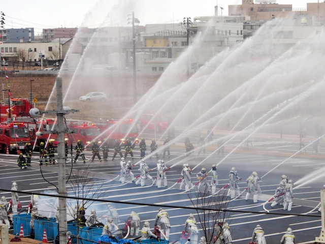 消防署員と消防団員が一斉放水した市消防出初め式=5日、市内日石町 (2014/01/06)
