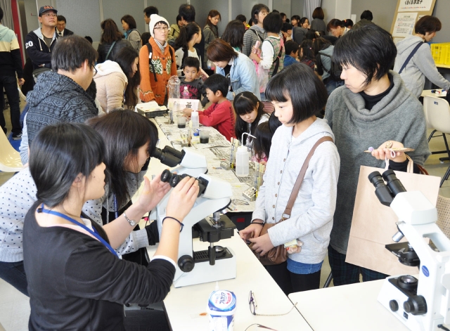 親子連れら1500人が来場した「科学の祭典」のブース=16日、新潟工科大 (2013/11/19)