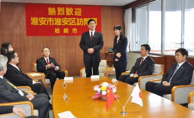 柏崎市へ表敬訪問した中国・淮安区の政府訪問団の一行。あいさつする陳団長(右から4人目)=21日、市役所市長応接室 (2013/11/21)
