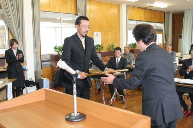専農経営者会議のコシヒカリ実食食味コンテストで1位になった牧岡謙二さん(左) (2013/11/22)