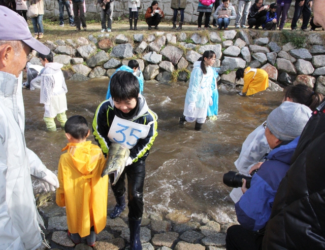 大きなサケを捕まえて笑顔の子どもたち=23日午前、柏崎さけのふるさと公園 (2013/11/25)