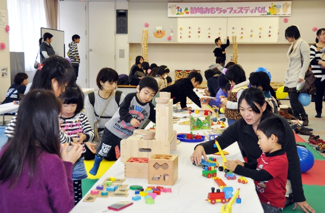 優良おもちゃがたくさん並び、夢中で遊ぶ子どもたち=市総合福祉センター (2013/11/27)