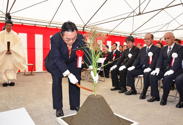 ブルボン本社新社屋の起工式で鎌入れを行う吉田康社長=市内駅前1 (2013/10/19)