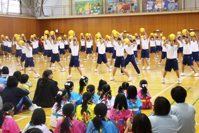 県レクリエーション大会で3B体操を披露する三中1年生=20日、比角小体育館 (2013/10/22)