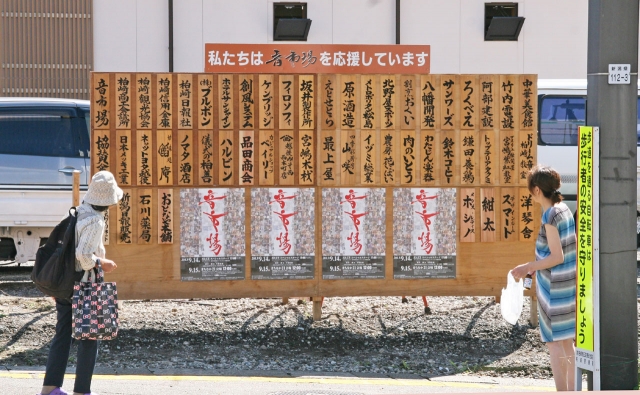 まちなか22会場を歌や演奏などでつなぐ「音市場」のPR看板=市内東本町2 (2013/09/11)