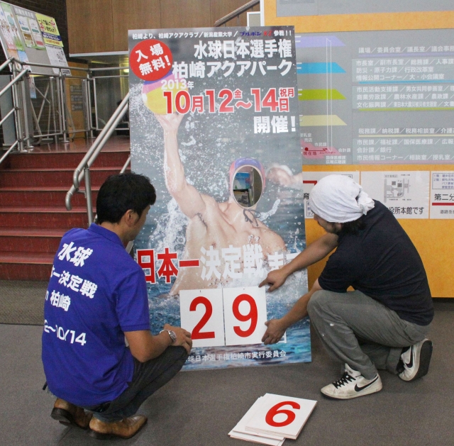 水球日本選手権のカウントダウンボード=市役所正面玄関ロビー (2013/09/13)