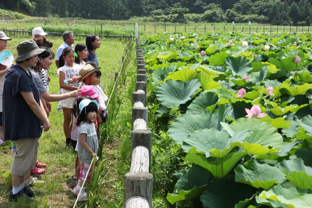 今が見ごろのハスの花を楽しむ市内吉井町内会の人たち=28日 (2013/07/30)