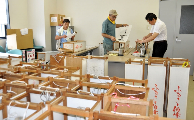 市内外から寄せられた作品を、あんどんにする作業=30日、フォンジェ会議室 (2013/07/31)