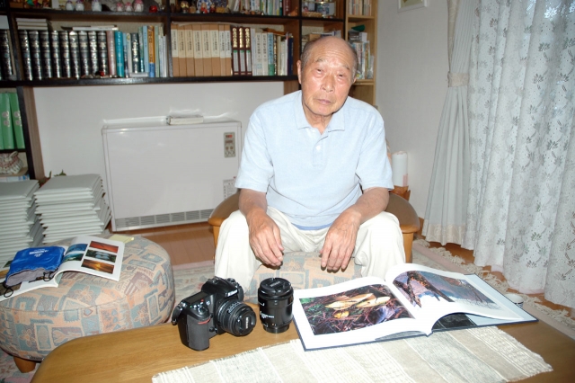 写真集を出版した菅沢重蔵さん。傍らに愛用のカメラ=市内松美1の自宅 (2013/08/01)