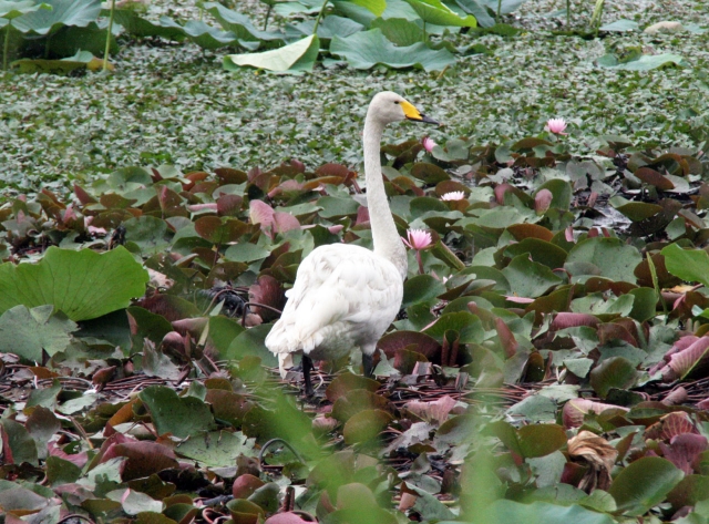 スイレンやハスの中で、3度目の夏を過ごすハクチョウ=7月29日、市内西山町五日市の大池 (2013/08/02)