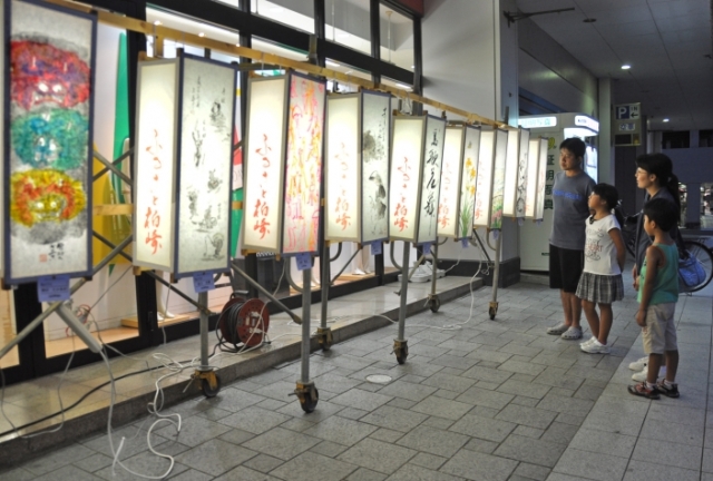 ずらりと並ぶ絵あんどん作品に見入る家族連れら=3日夜、市内東本町1 (2013/08/05)
