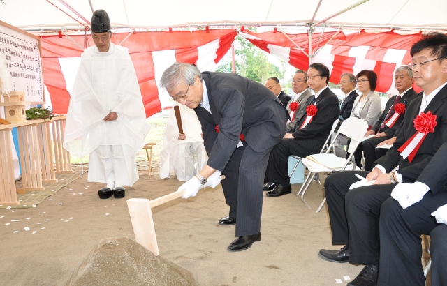 仮称・柏崎駅前特別養護老人ホームの起工式でくわ入れを行う星山理事長=6日、市内鏡町地内 (2013/08/06)