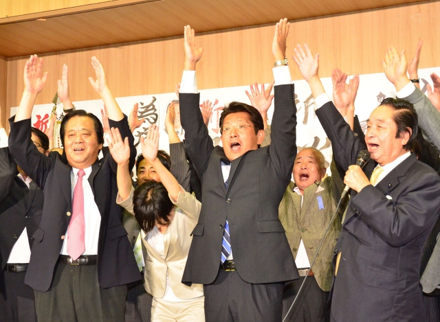 参院選で再選を果たし万歳をする塚田一郎さん(中央)=21日、新潟市中央区新光町の自民党県連 (2013/07/22)