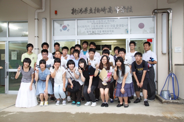 研究発表を行った新道林と柏高の生徒=柏高玄関前 (2013/07/23)
