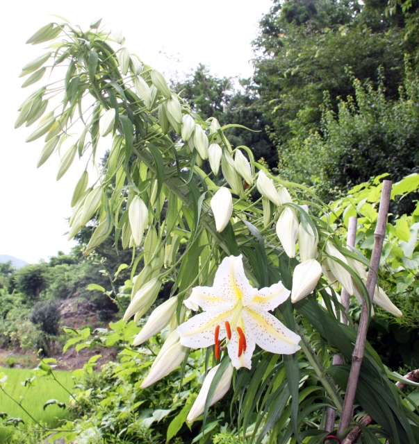 つぼみが100個もついた帯化ヤマユリ=22日、市内野田 (2013/07/24)