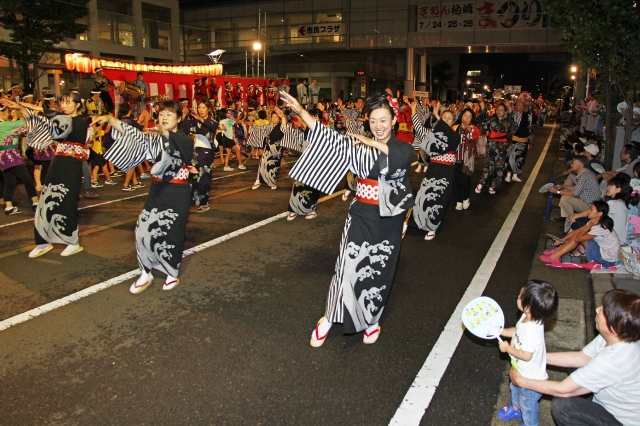 踊り絵巻で市民の元気を示した民謡街頭流し=24日夜、」市内東本町1 (2013/07/25)