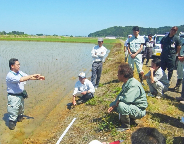 オーダーメード肥料を使った水田で行われた生育調査=市内南条地内 (2013/06/13)