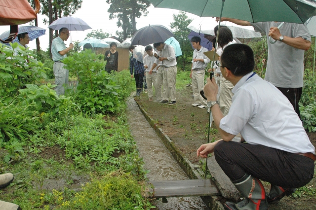小水力発電を目指し、農業用水路の流速を計測する柏工生ら=19日、市内野田地内 (2013/06/20)