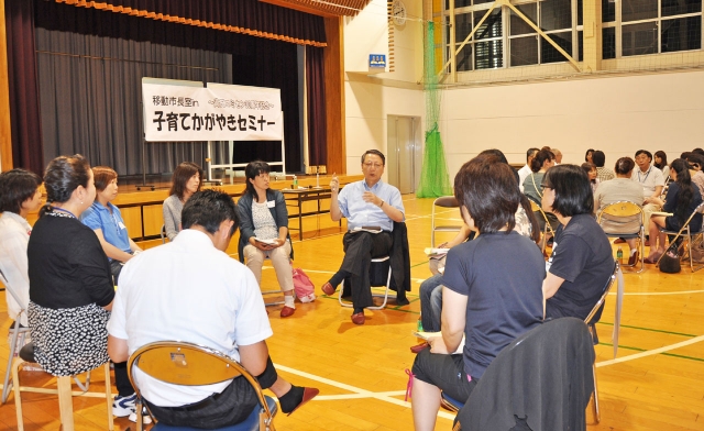 子育てかがやきセミナーで行ったグループ懇談。中央は会田市長=19日夜、高田コミセン (2013/06/21)