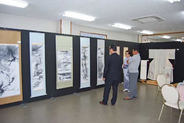 4日まで開催中の笹川春艸さんの墨画展=1日、市内扇町のクワバラ特設会場 (2013/06/01)