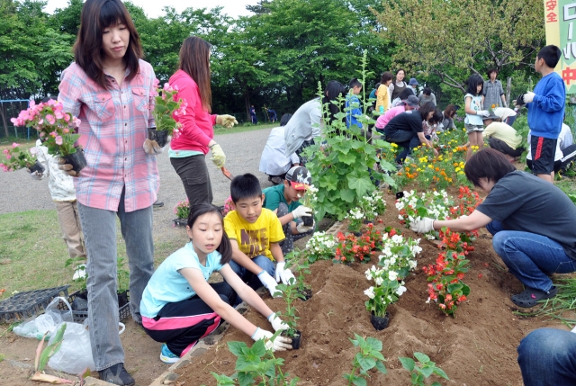 全市で行われた「クリーンデー柏崎」。米山台町内会の第4公園では子どもたちが花苗植えに精を出した=2日 (2013/06/03)