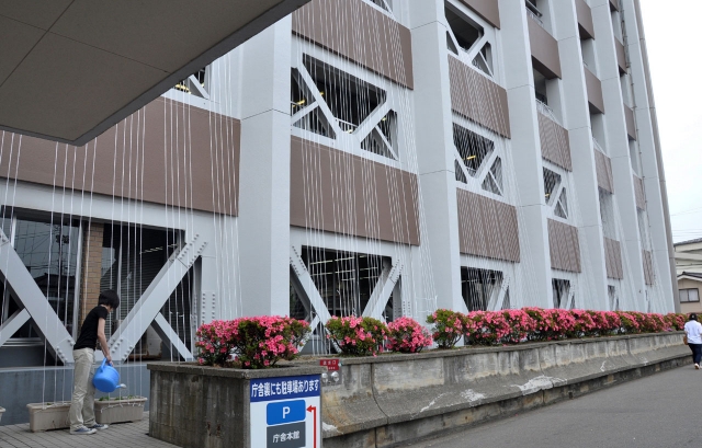 3階までひもが張られた市役所本庁舎の「緑のカーテン」 (2013/06/11)