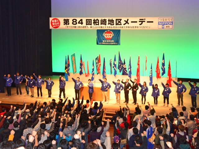 連合地協の柏崎地区メーデーで「団結頑張ろう」と拳を突き上げる参加者=アルフォーレ (2013/04/27)