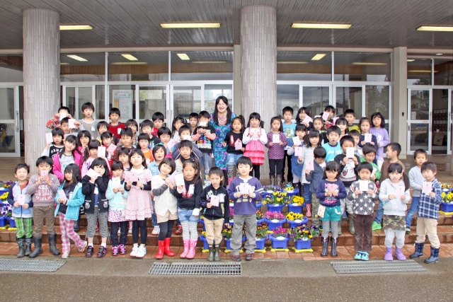講演で命の大切さを呼び掛けた丹後まみこさん(中央)と剣野小1年生 (2013/05/01)