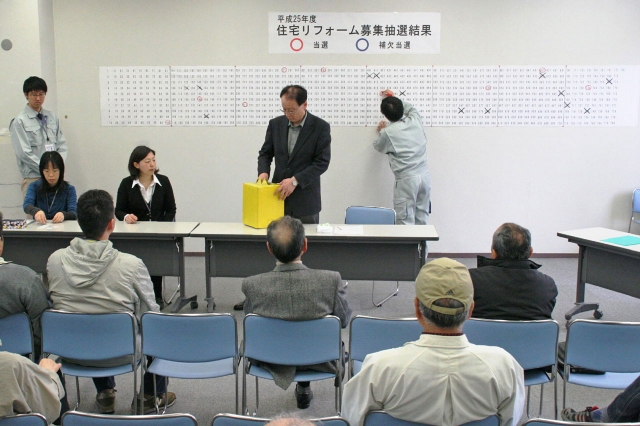 応募者が見守る中で行われた住宅リフォーム改修補助金事業抽選会=市役所第2分館 (2013/05/02)
