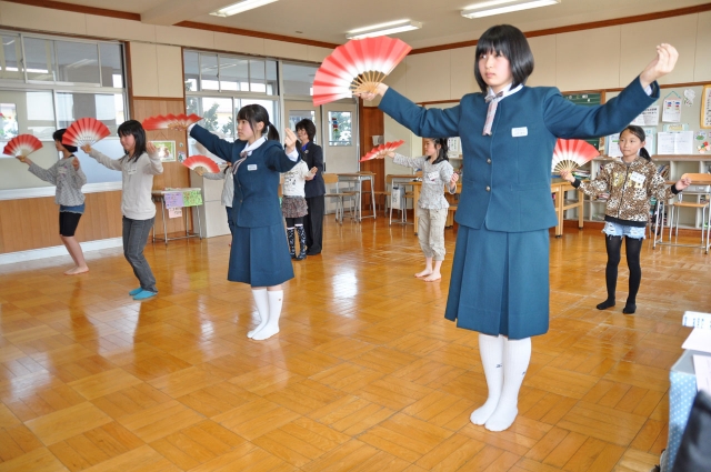 伝承学習で綾子舞の練習に取り組む南中、新道小の児童生徒=9日、南中 (2013/05/10)