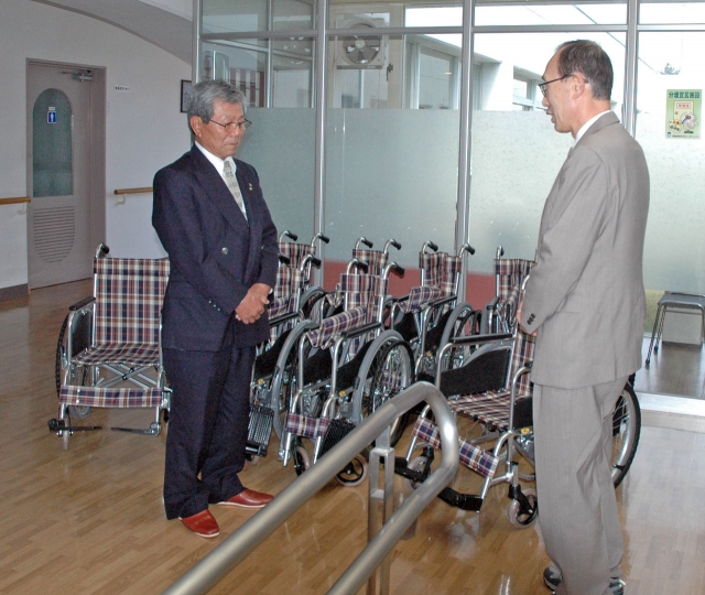 かしわ荘などに車椅子を寄付する木村社長(左)と歌代理事長=15日 (2013/04/17)