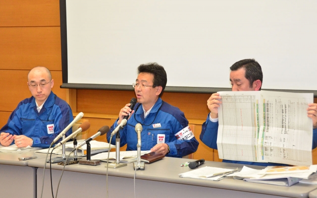 断層調査結果を説明する東京電力柏崎刈羽原発の武田智吉・土木グループマネージャー(中央)ら=18日、同原発ビジターズハウス (2013/04/19)