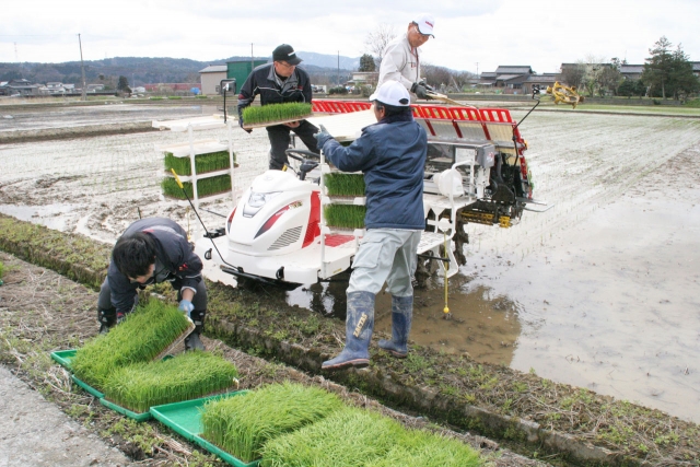 前日までの寒波も和らいだ中でスタートした田植え=市内藤井 (2013/04/20)