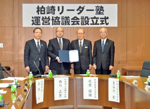柏崎リーダー塾運営協議会の設立確認書に署名を行った4団体の代表=22日午前、柏崎商議所 (2013/04/22)
