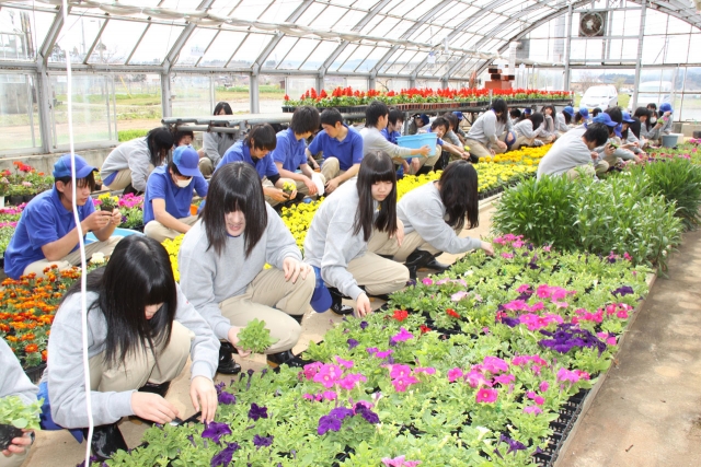 温室で販売用の苗の花がら摘みなどをする柏総生 (2013/04/26)