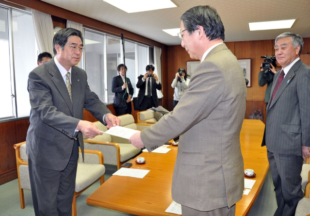 達増・岩手県知事からの礼状を会田市長に手渡す工藤・同県環境生活部長=27日、市役所市長応接室 (2013/03/28)