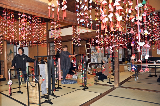 「つるしびな」展の開催に向けて準備を進める高田、半田コミセンの関係者=28日、市内新道の飯塚邸 (2013/03/29)