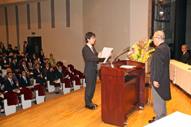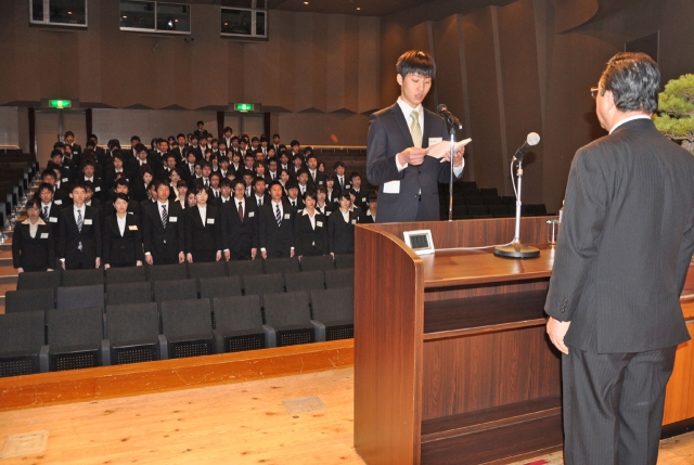 84人の新入生を代表して誓いの言葉を述べる入学生=3日、新潟産大講堂 (2013/04/03)