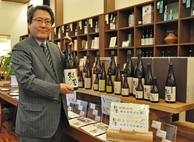 創業200年の節目を記念して、10日から発売する「彩シリーズ」と原社長=市内新橋、原酒造 (2013/04/04)