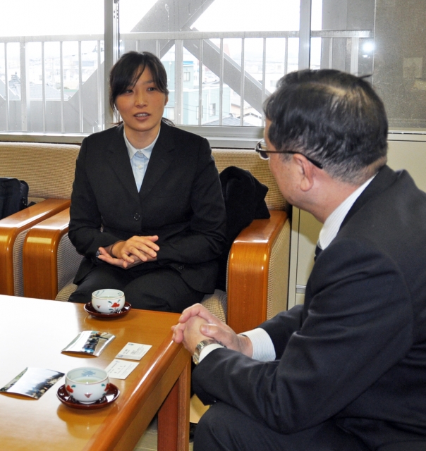 山田副市長に青年海外協力隊として、フィジー派遣を報告する山岸さん=13日、市役所副市長室 (2013/03/14)