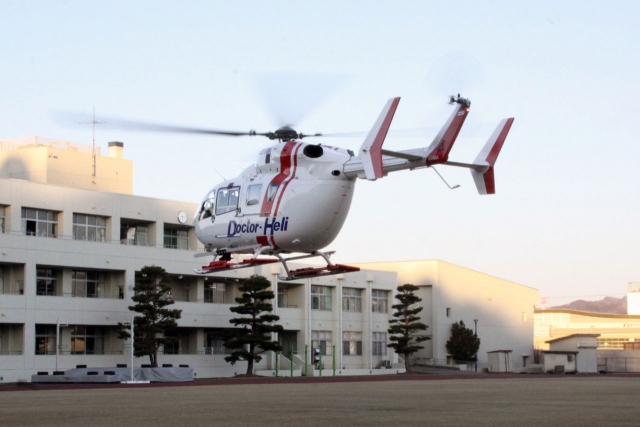 患者を乗せて飛び立つドクターヘリ=刈羽中グラウンド (2013/03/16)
