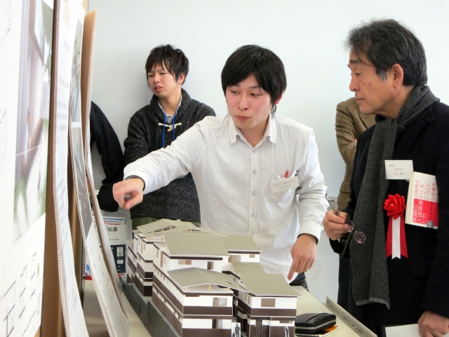 北関東甲信越学生課題設計コンクールで審査員にプレゼンテーションを行う小池さん(中央) (2013/03/19)