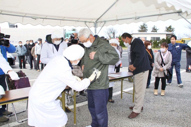 原子力防災訓練でスクリーニングを受ける市内西山町二田地区の住民=23日、北陸自動車道下り線黒埼サービスエリア (2013/03/23)