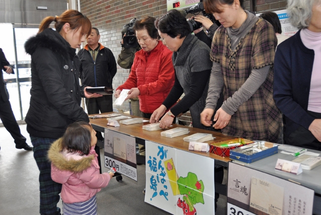 「あの時の記憶」メッセージ和紙はがきの販売=11日、市役所ロビー (2013/03/11)