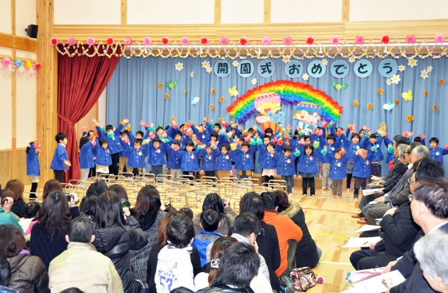 待望の保育園棟が完成した北鯖石保育園の開園式。園児たちが歌や遊戯で元気いっぱいに喜びを表した=9日 (2013/02/09)