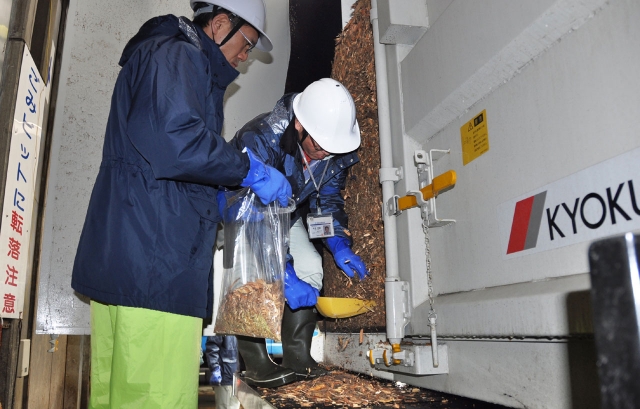 震災がれきの本格焼却の前に、木くずのサンプルを採取=クリーンセンターかしわざき (2013/02/13)