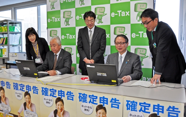 電子申告システムで入力する会田市長と品田村長=13日、柏崎税務署 (2013/02/14)