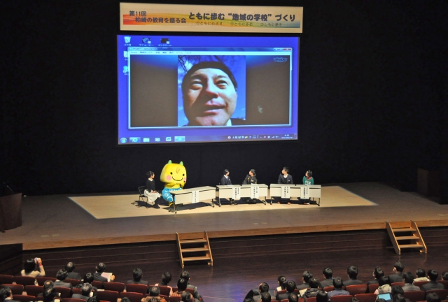 テレビ電話中継でメッセージも寄せられた「教育を語る会」の初の子ども会議=16日、アルフォーレ・大ホール (2013/02/18)