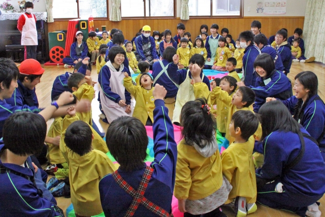 保育実習で園児と一緒に遊ぶ柏高2年生=明照保育園 (2013/02/19)