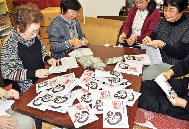 節分を前に、えんま通り商店街で販売する「福豆」。女性有志のグループが準備を進めた (2013/01/19)